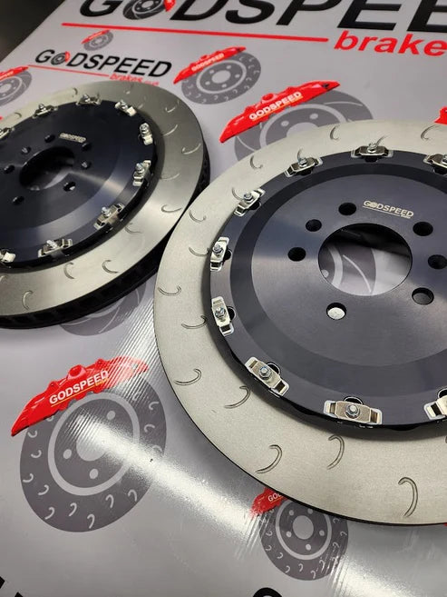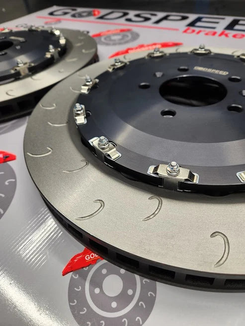 Our discs have G hook design which improves pad bite over the OEM plain disc. Our discs are also 0.5kg per disc lighter than the OEM. The bells are anodised black to help with corrosion.