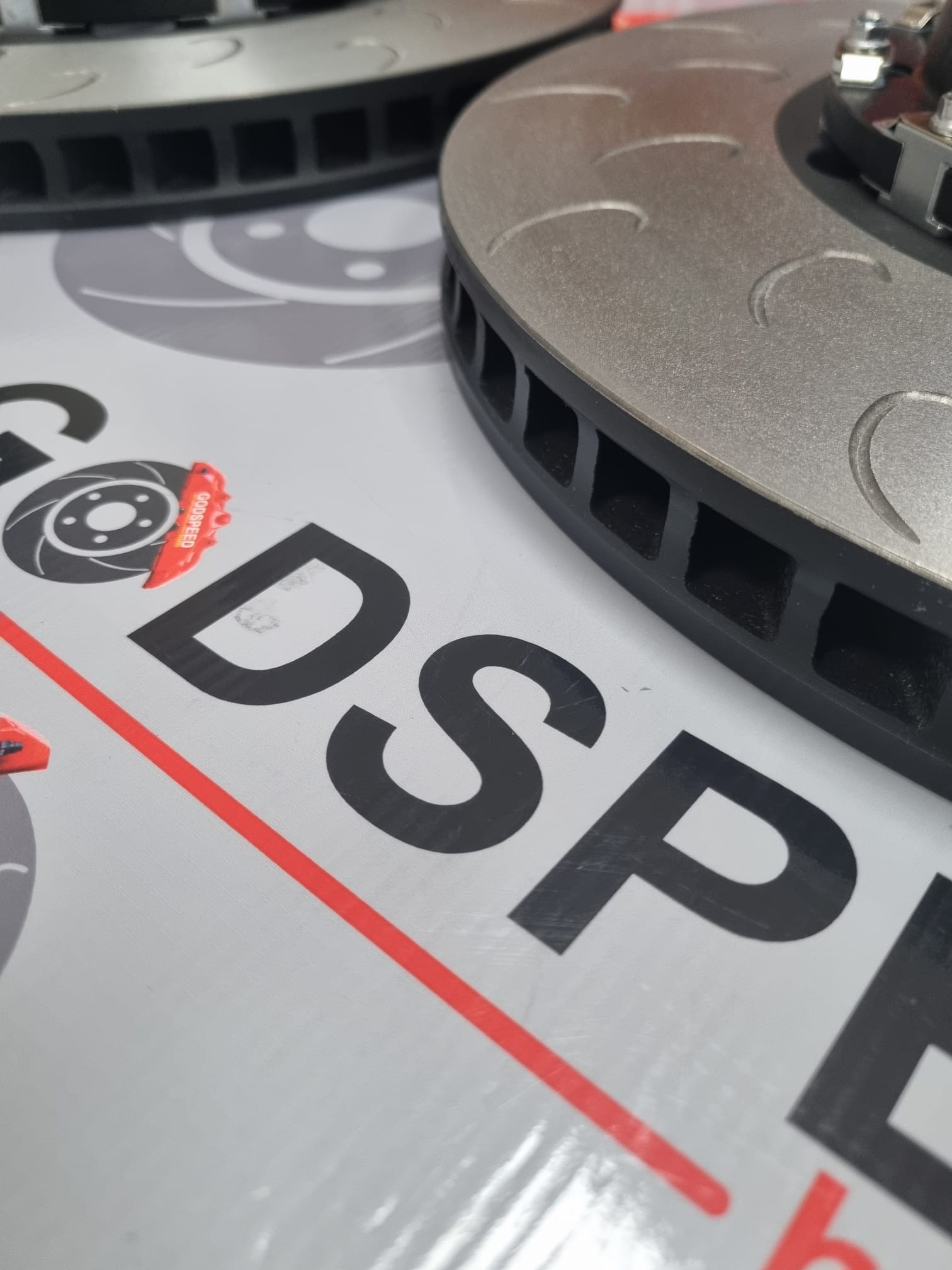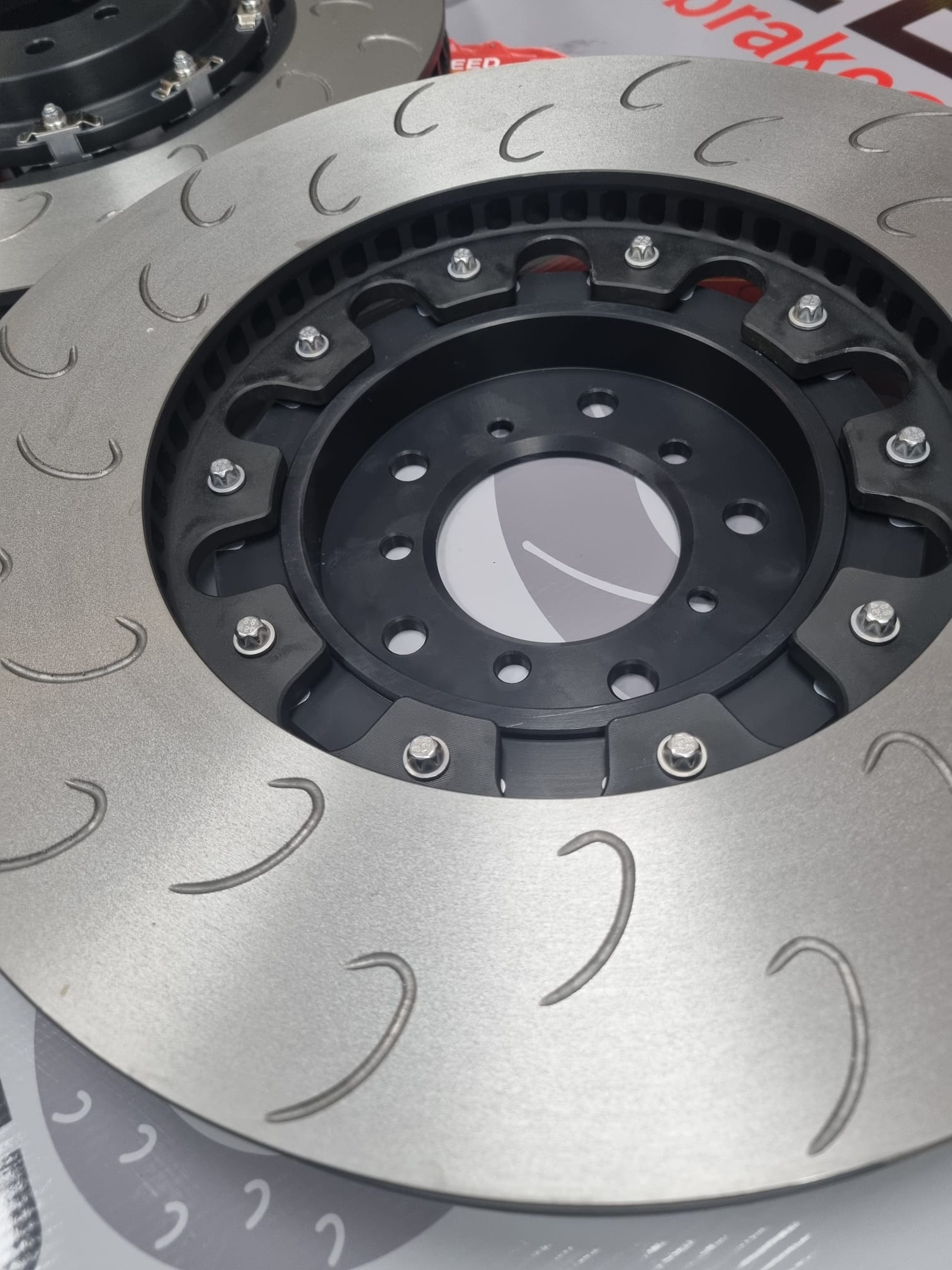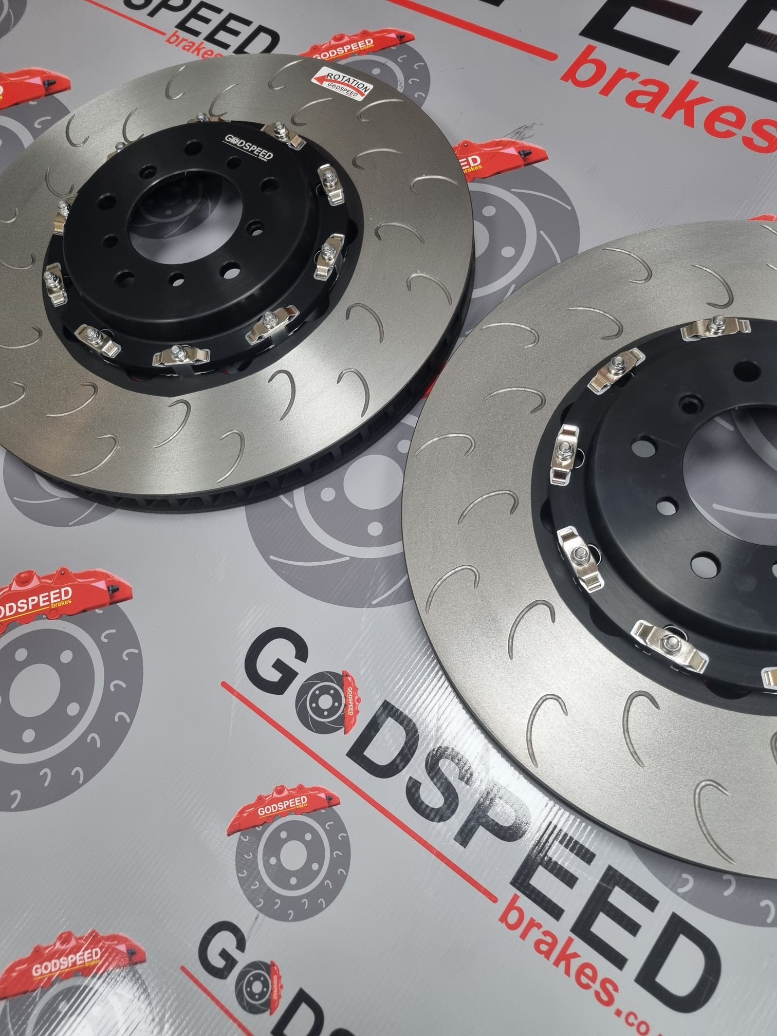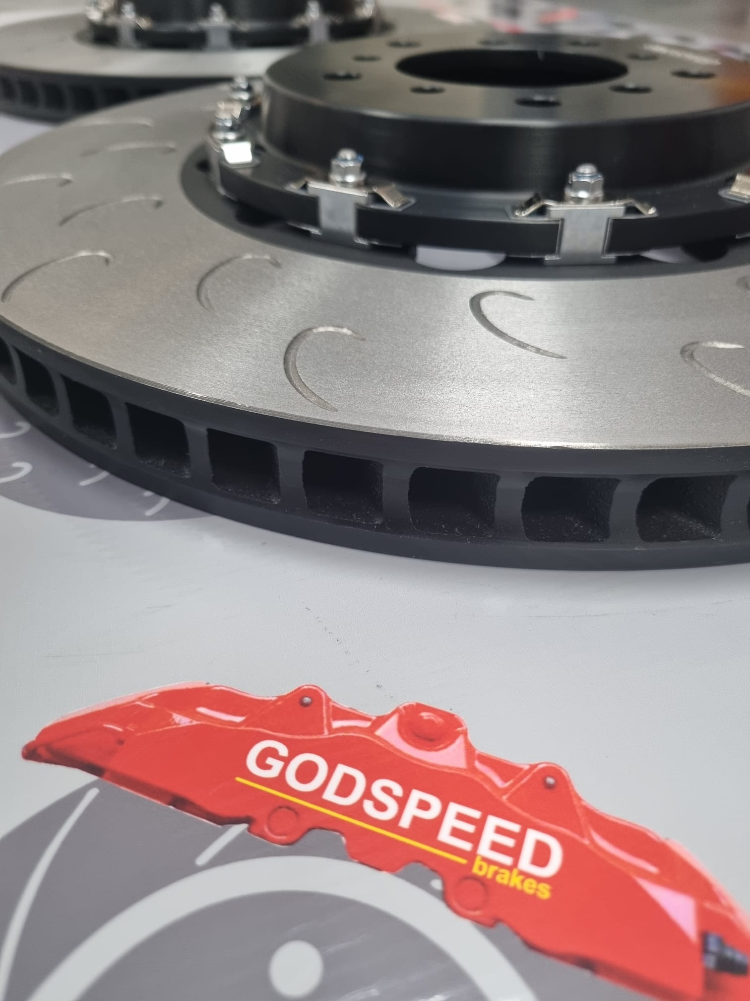 So these 380mm x 30mm fully floating discs and bells are the ideal setup to fit the 4 pot F80 blue calipers , they are our heat treated curved vane high carbon race discs and have sprung loaded fully floating bobbins which are quiet as they are sprung loaded.
