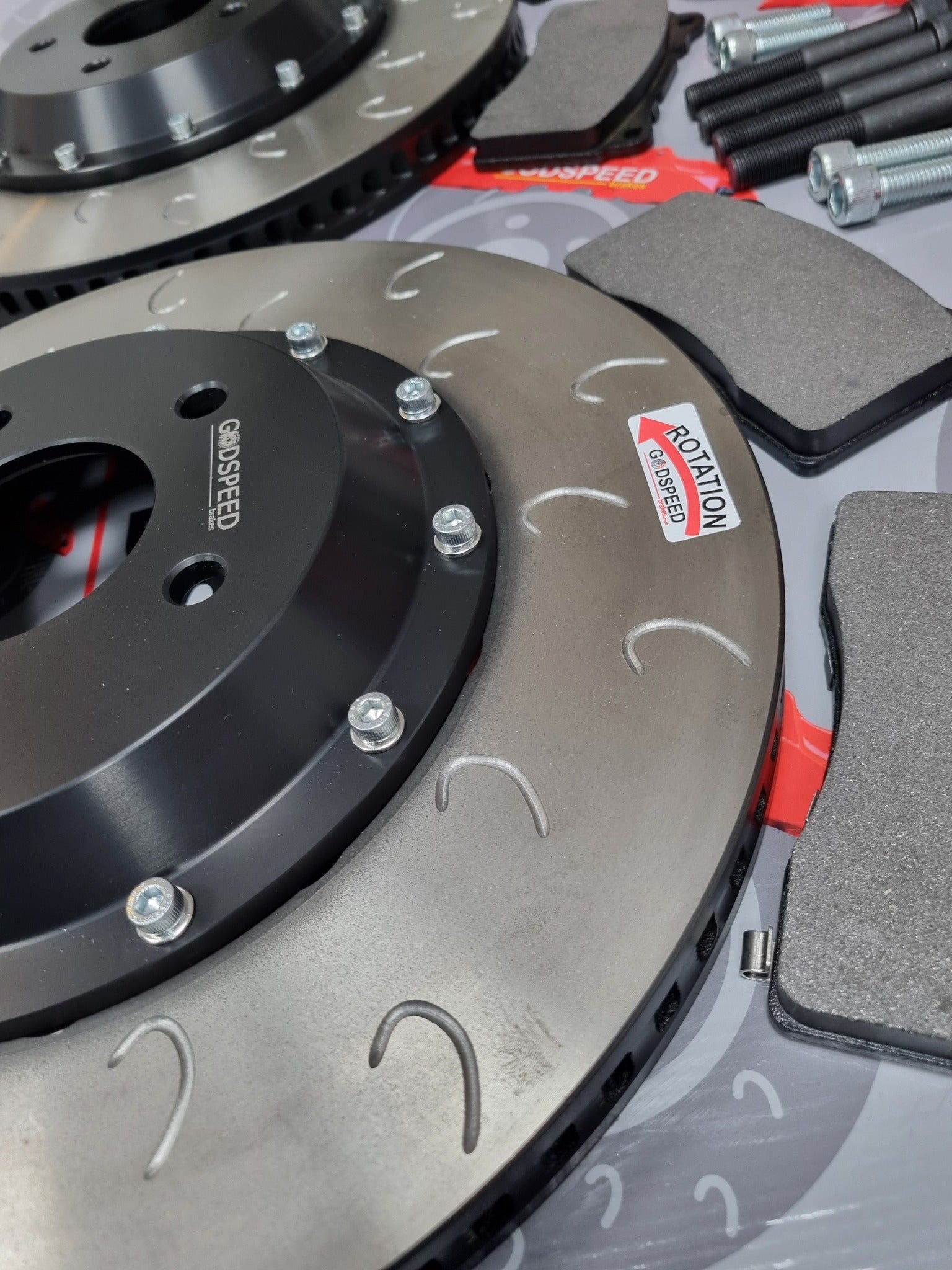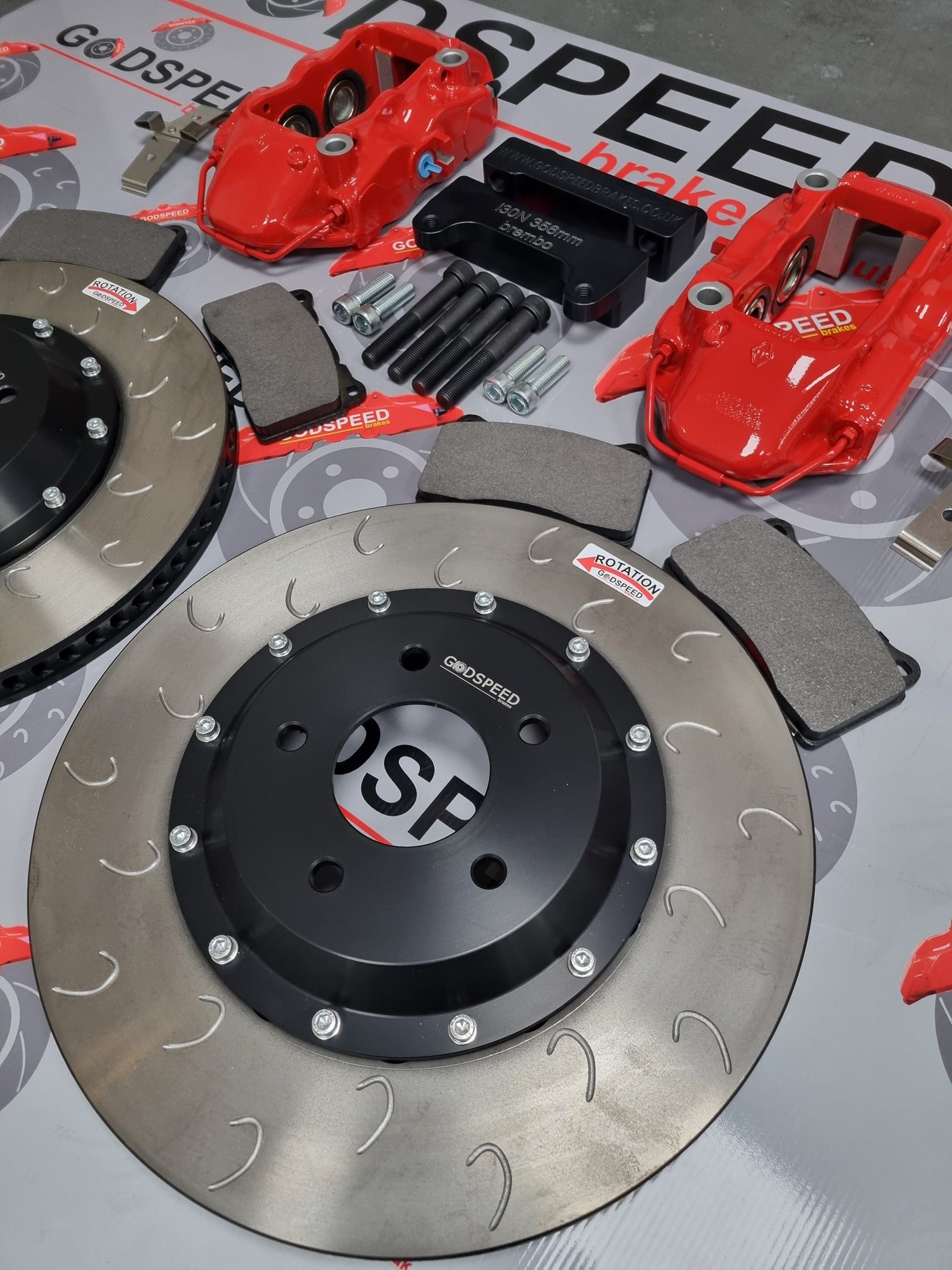 Complete bolt on kit , using our 356mm race spec, curved vane rotors , can be supplied with bolted bells , or fully floating bells.